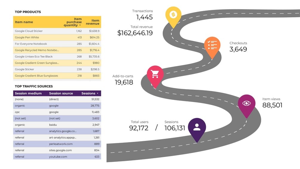 This is a set of nice Google Analytics (GA4) Ecommerce infographics filled with up to date date (ecommerce metrics). Additionally on the setup page, you can set a date range and filters (source, medium, country, device category).