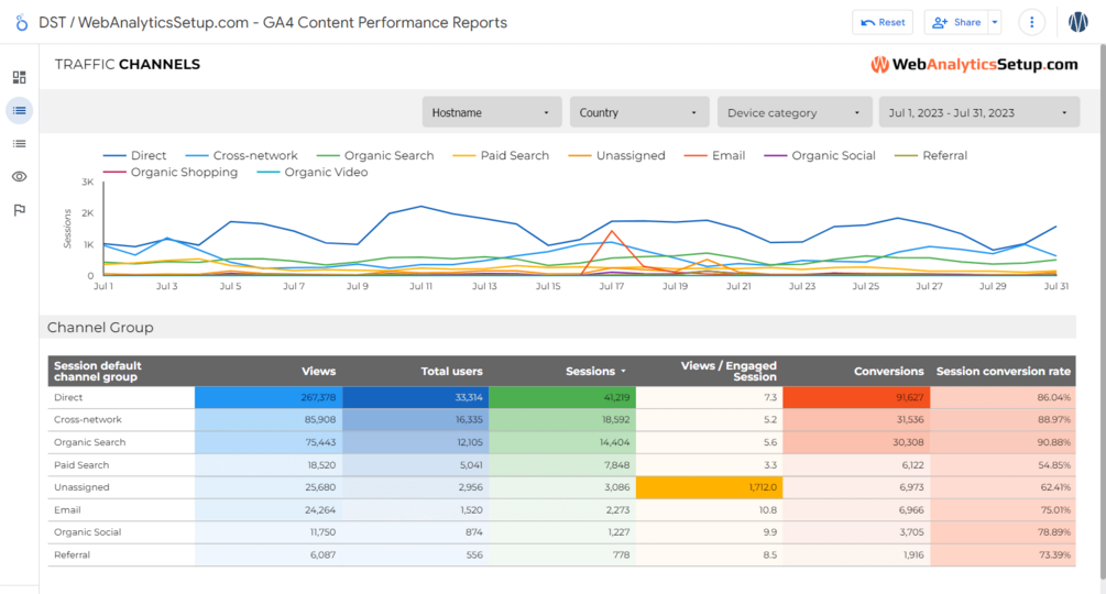 • Traffic sources by Channel Group and key metrics